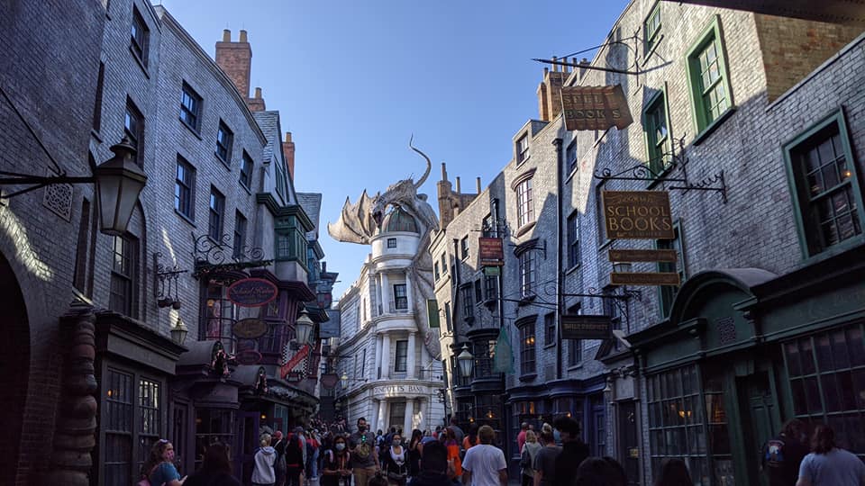 Plus, since most kids were in school at that time, the crowds weren’t too bad. However, there were still plenty of crowds, even during the pandemic. Universal still did an amazing job of keeping things safe in spite of Covid-19. They took our temperatures every day and gave us a wrist band if we were clear. Then we could just show our band at the entrance of Universal or to get back into the hotel. At the Universal parks, they had us wear masks and pumped hand sanitizer into our hands before every ride. Plus they were really great about enforcing social distancing in the lines and on the rides.