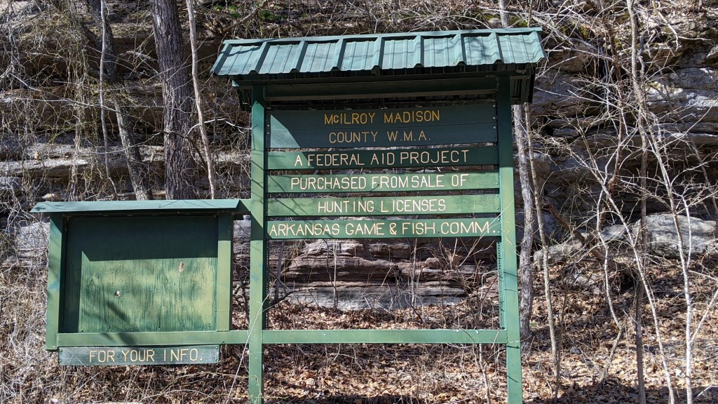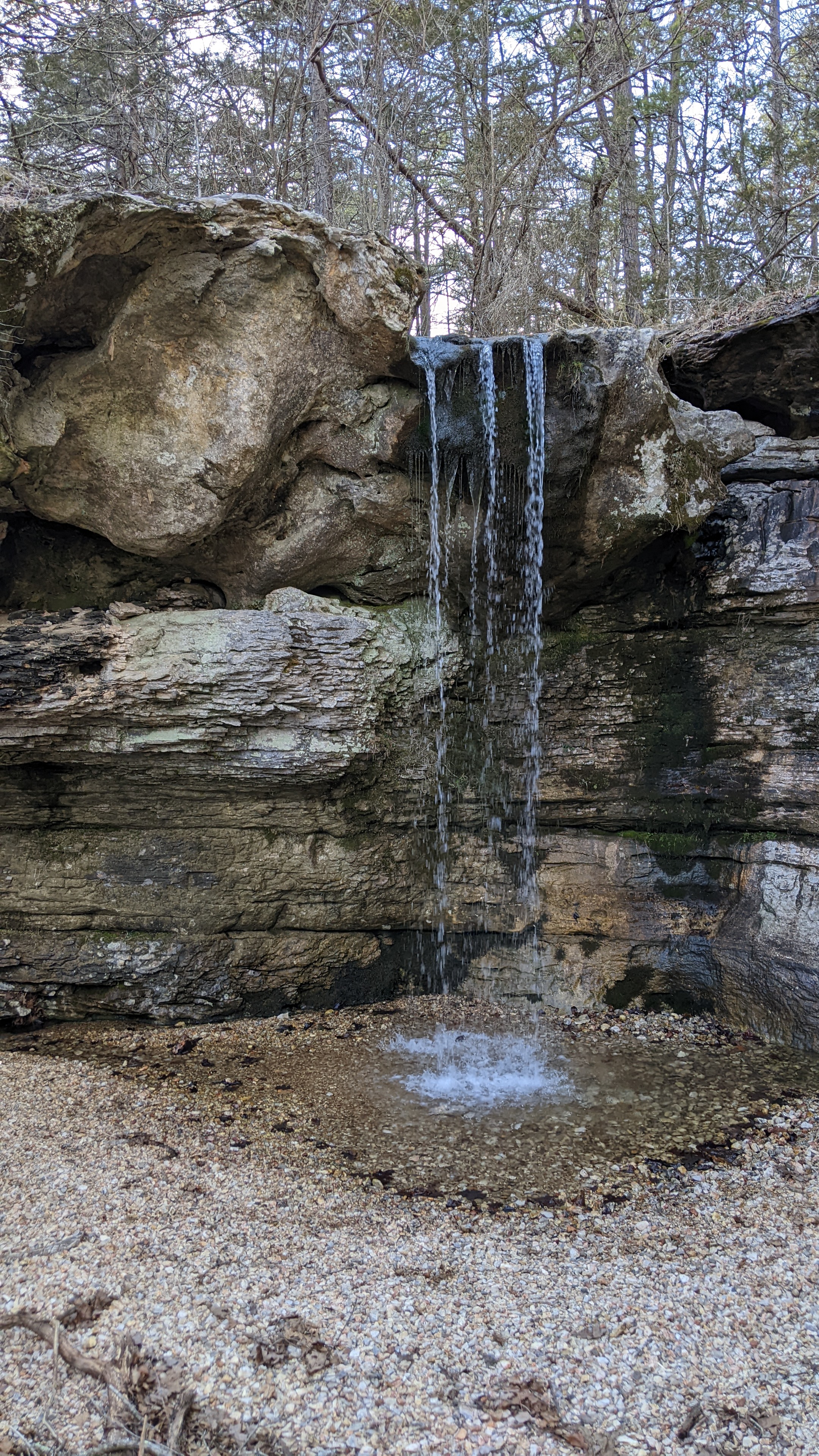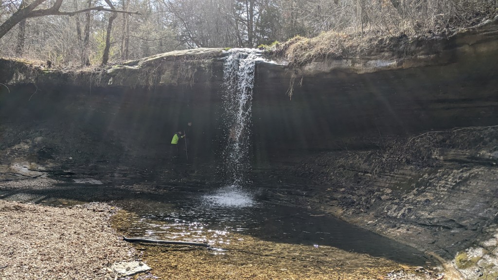 I am a huge fan of waterfalls, so I did some research and found two that are nearby Withrow Springs. The closest one to the park is called Glory B Waterfall, so we went there after a picnic lunch. It was so pretty and worth the work to find it!! It does come up on Google maps, but it’s not exactly easy to find after you arrive if you don’t know what you’re looking for. Once you arrive, look for this sign and park by it. This is the closest area to park by the waterfall.