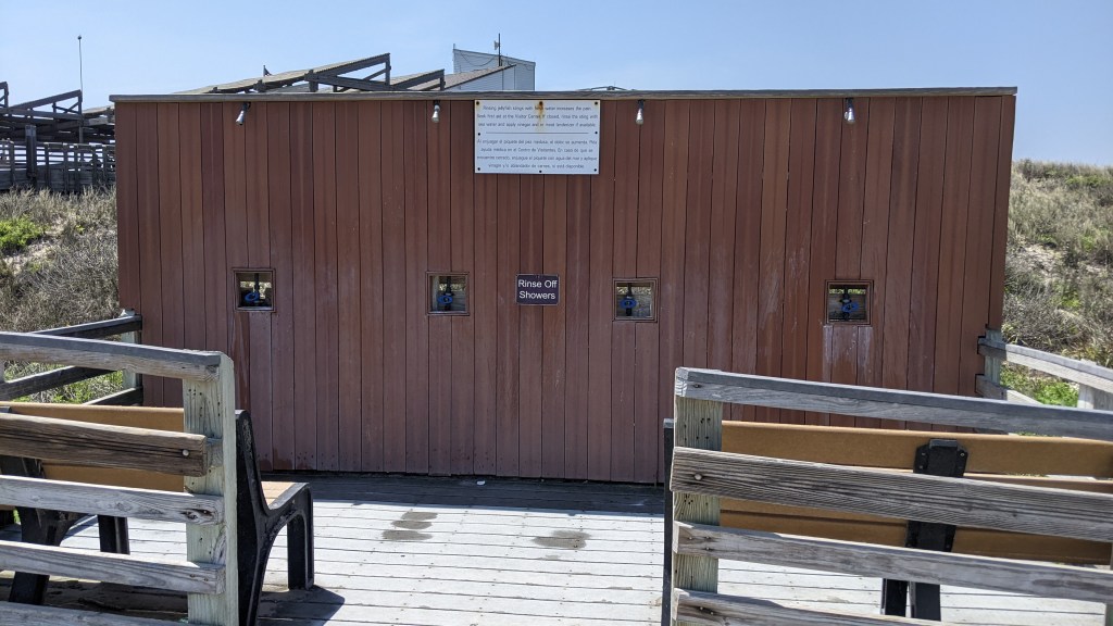 There are showers on your way up the ramp to rinse off all the sand on your way out!